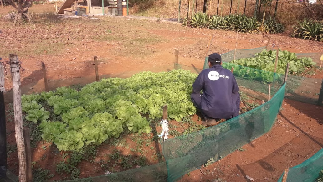 A Inoxcolor cultiva em seu terreno uma horta com variedades de hortaliças. E disponibiliza aos seus funcionários e familiares, verduras e legumes saldáveis, livres de qualquer tipo de contaminação química, totalmente naturais. Todos os dias os funcionários colhem alimentos frescos para o almoço e jantar
