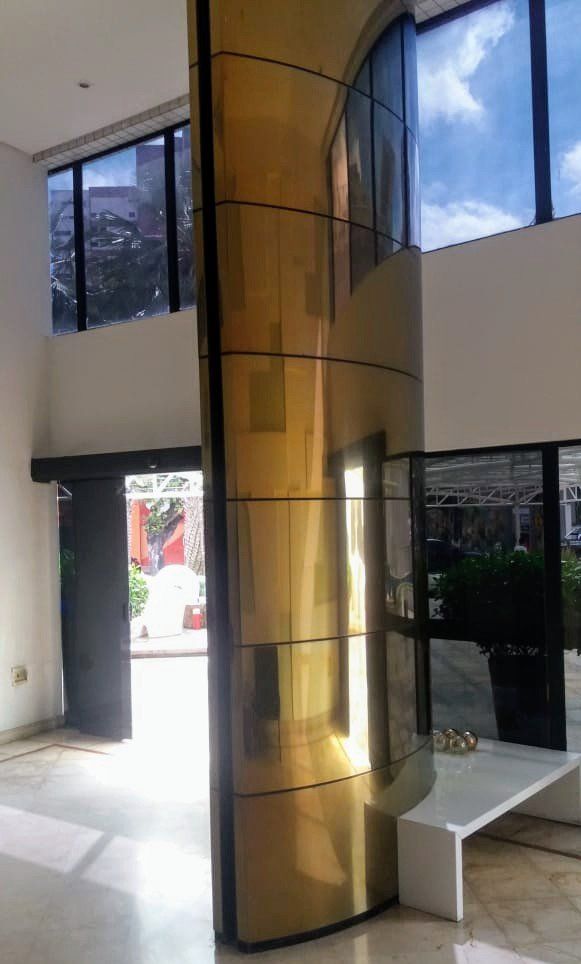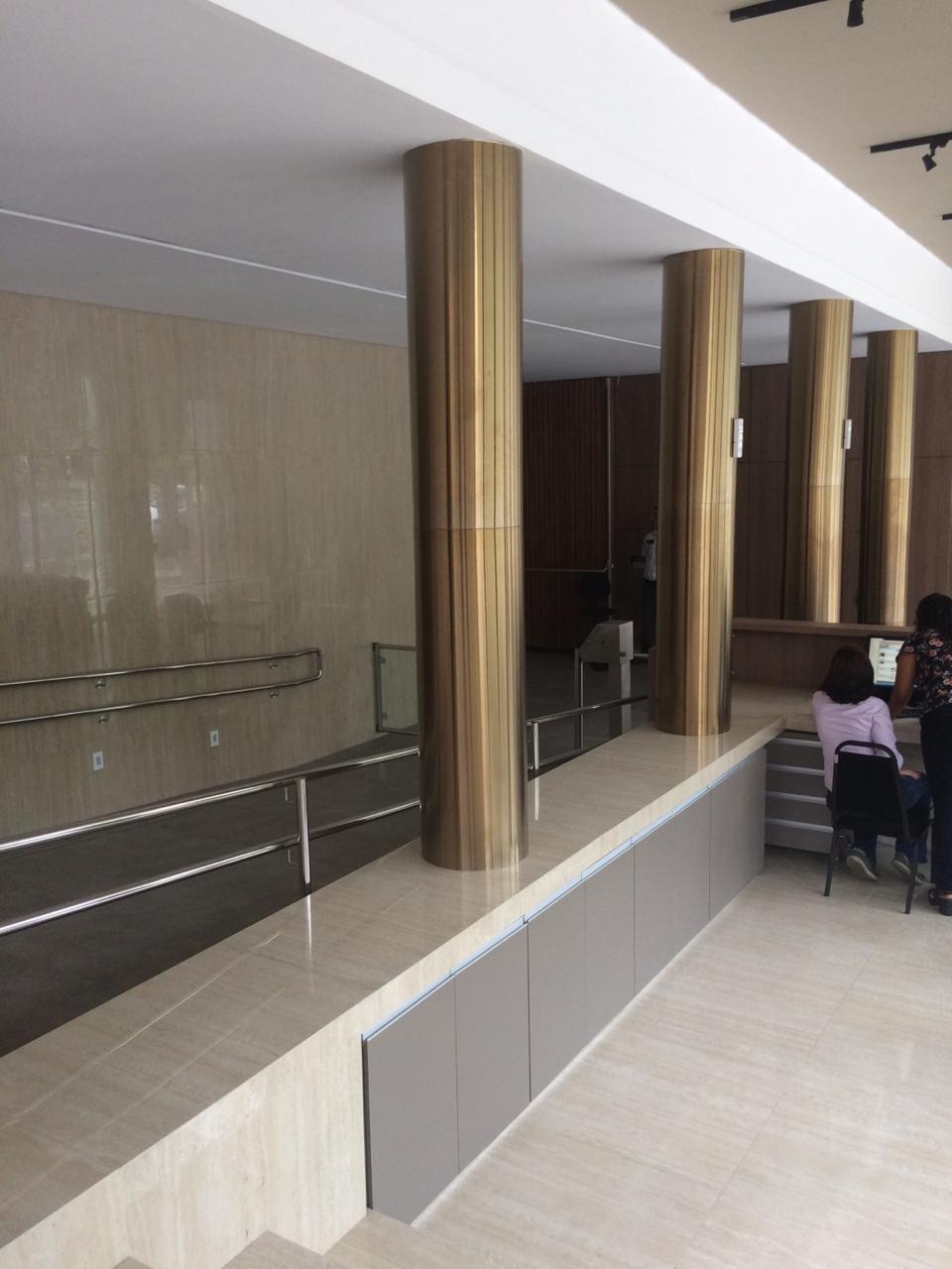 O revestimento para colunas disponível em 3 acabamentos: Polido BB ou BA, Mirror Finishe e Escovado. E 7 cores : azul, bronze, dourado, púrpura, verde, marrom e preto.