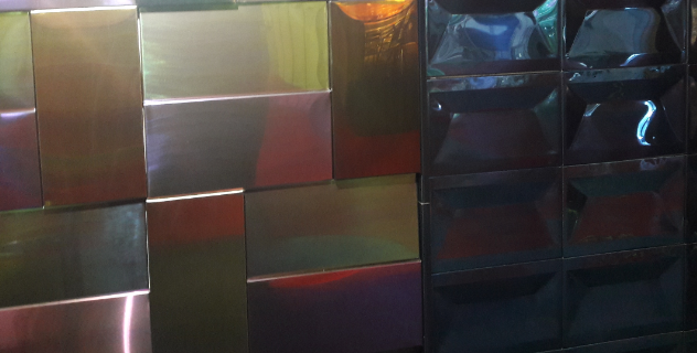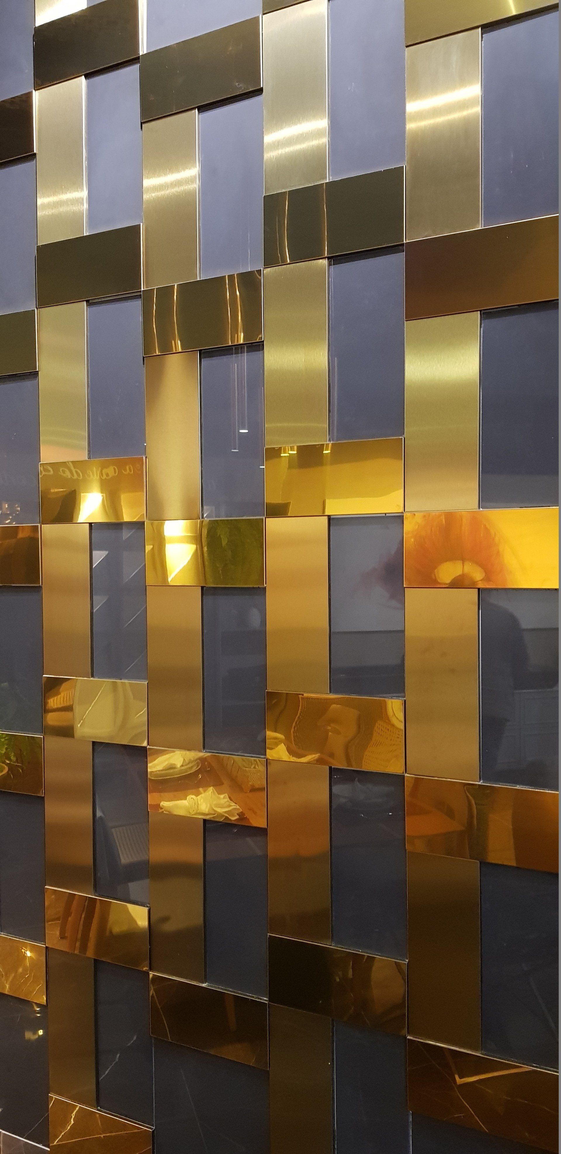 Os formatos dos revestimentos 3D foram desenvolvidos para criar o aspecto 3D ao ambiente. Produzidos em 3 acabamentos, Polido BA ou BB, Mirror Finishe e Escovado, disponíveis em 7 cores: azul, bronze, dourado, púrpura, verde, marrom e preto.
